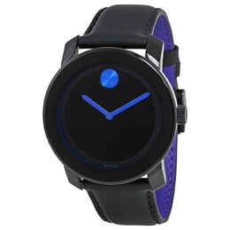 Black TR90 resin case with a black leather strap. Fixed TR90 black composite bezel. Black dial with blue hands. No markers. The Movado Dot appears at the 12 o'clock position. Date display at the 6 o'clock position. Battery operated quartz movement. Scratch resistant sapphire crystal. Textured crown. Solid case back. Case diameter: 42 mm. Hidden folding clasp. Water resistant at 30 meters / 100 feet. Functions: hours, minutes, seconds, chronograph, date. Movado Bold 42 mm Black Dial Unisex Men's Watch 3600015