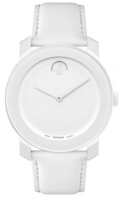 TR90 composite and stainless steel case with a white leather strap with purple lining. Fixed bezel. White dial with silver-tone hands. No markers. movado dot marks the 12 o'clock position. Dial Type: Analog. Quartz movement. Scratch resistant K1 crystal. Solid case back. Case diameter: 42 mm. Round case shape. Tang clasp. Water resistant at 30 meters / 100 feet. Functions: hour, minute. Casual watch style. Watch label: Swiss Made. Movado Bold White Dial White Leather Unisex Watch 3600024.