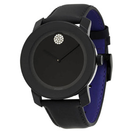 Stainless steel case with a black leather strap with purple lining. Black bezel. Black dial with black-tone hands. Movado dot at the 12 o'clock position set with 21 crystals. Dial Type: Analog. Quartz movement. Scratch resistant mineral crystal. Case diameter: 42 mm. Tang clasp. Water resistant at 30 meters/ 100 feet. Functions: hours, minutes. Additional Info: swarovski crystal marker. Casual watch style. Movado Bold 42 mm Black Dial With Swarovski Crystal Marker Black Leather Strap Unisex Watch 3600044.