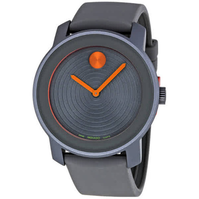 Grey aluminum case with a grey silicone strap. Fixed bezel. Grey dial with orange tone hands. No markers. The signature Movado Dot appears at the 12 o'clock position. Dial Type: analog. Quartz movement. Scratch resistant K1 mineral crystal. Solid case back. Case diameter: 44 mm. Tang clasp. Water resistant at 30 meters/ 100 feet. Functions: hours, minutes. Casual watch style. Movado Bold Grey Aluminum Case Silicone Unisex Watch 3600071.