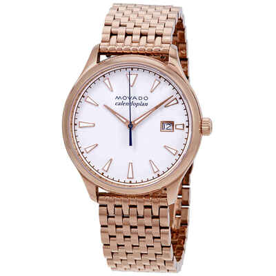 Rose gold-tone stainless steel case with a rose gold-tone stainless steel bracelet. Fixed rose gold-tone stainless steel bezel. White dial with rose gold-tone hands and index hour markers. Minute markers around the outer rim. Dial Type: Analog. Luminescent hands and markers. Date display at the 3 o'clock position. Quartz movement. Scratch resistant sapphire crystal. Pull / push crown. Solid case back. Round case shape. Case size: 36 mm. Butterfly clasp. Water resistant at 30 meters / 100 feet. Functions: date, hour, minute, second. Casual watch style. Watch label: Swiss Movt. Movado Heritage Calendoplan White Dial Ladies Watch 3650047.