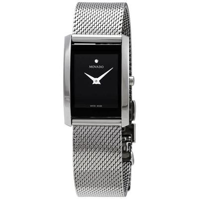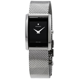 Silver-tone stainless steel case with a silver-tone stainless steel mesh bracelet. Fixed silver-tone stainless steel bezel. Black dial with silver-tone dauphine-style shape hands and the signature Movado dot appears at the 12 o'clock position. Dial Type: Analog. Quartz movement. Scratch resistant k1 crystal. Pull / push crown. Solid case back. Rectangle case shape. Case size: 21 mm x 29 mm. Deployment with push button release clasp. Water resistant at 30 meters / 100 feet. Functions: hour, minute. Dress watch style. Watch label: Swiss Made. Movado La Nouvelle Black Dial Ladies Mesh Watch 0607188.