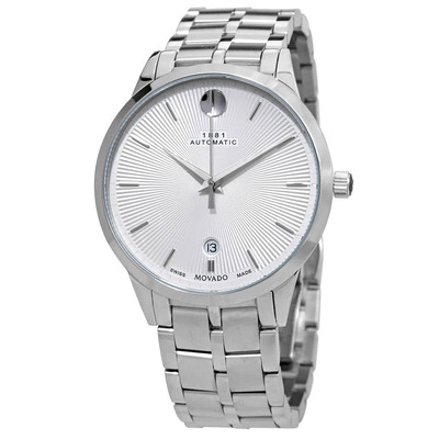 Stainless steel case with a stainless steel bracelet. Fixed stainless steel bezel. White dial with silver-tone hands and index hour markers. The Movado dot appears at the 12 o'clock position. Dial Type: Analog. Date display above the 6 o'clock position. Automatic movement. Scratch resistant sapphire crystal. Transparent case back. Round case shape. Case size: 39 mm. Band width: 20 mm. Fold over clasp. Water resistant at 30 meters / 100 feet. Functions: date, hour, minute, second. 1881 Series. Dress watch style. Watch label: Swiss Made. Movado 1881 Automatic White Dial Mens Watch 0607462.