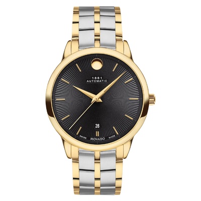 Two-tone (silver-tone and gold-tone) stainless steel case and bracelet. Gold-tone bezel. Black dial with gold-tone hands and index hour markers. Dial Type: Analog. Date display at the 6 o'clock position. Automatic movement. Scratch resistant sapphire crystal. Transparent see through case back. Round case shape, case size: 39 mm. Deployment clasp. Water resistant at 30 meters / 100 feet. Functions: date, hour, minute, second. 1881 Automatic Series. Watch label: Swiss Made. Movado 1881 Automatic Black Dial Mens Watch 0607463.