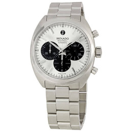 Stainless steel case with a stainless steel link bracelet. Fixed stainless steel bezel. Silver dial with luminous hands and stick hour markers. Minute markers around the outer rim. Luminescent hands and markers. Date display at the 12 o'clock position. Chronograph - three black sub-dials displaying: 60 seconds, 30 minutes and 12 hours. Swiss automatic movement. Scratch resistant mineral crystal. Push / pull crown. Screw down skeleton case back. Case diameter: 40 mm. Case thickness: 12 mm. Deployment clasp. Water resistant at 50 meters / 165 meters. Movado Mens Datron Automatic Chronograph Watch 0606365