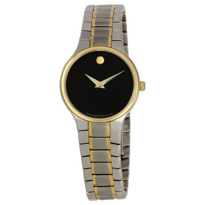 Stainless steel case with a two-tone (silver and gold-tone) stainless steel link bracelet. Fixed gold-tone bezel. Black dial with gold-tone hands. The signature Movado Concave Dot marks the 12 o'clock position. Quartz movement. Scratch resistant sapphire crystal. Push / pull crown. Solid case back. Case diameter: 26 mm. Case thickness: 6 mm. Tang clasp. Water resistant at 30 meters/ 100 feet. Functions: hours, minutes. Movado Serio Ladies Watch 0606389.
