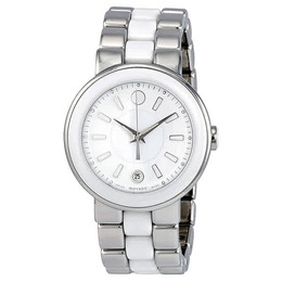 Stainless steel case with a stainless steel bracelet with white ceramic center links. Fixed stainless steel with an inlaid white ceramic bezel. White dial with silver-tone hands and index hour markers. Minute markers around the outer rim. Dial Type: Analog. Luminescent hands and markers. Date display at the 6 o'clock position. Quartz movement. Scratch resistant sapphire crystal. Solid case back. Round case shape. Case size: 36 mm. Case thickness: 7.3 mm. Band width: 20 mm. Fold over clasp with a push button release. Water resistant at 30 meters / 100 feet. Functions: date, hour, minute, second. Cerena Series. Casual watch style. Watch label: Swiss Made. Movado Cerena White Dial Stainless Steel and Ceramic Ladies Watch 0606539.