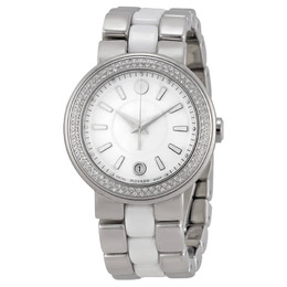 Stainless steel case with a white ceramic and stainless steel bracelet. 120 diamonds (0.504 t.c.w.) bezel. White dial with silver-tone hands and index hour markers. Minute markers around the outer rim. the mavado dot apperas at the 12 o'clock position. Dial Type: Analog. Date display at the 6 o'clock position. Quartz movement. Scratch resistant sapphire crystal. Solid case back. Case diameter: 36 mm. Round case shape. Deployment with push button clasp. Water resistant at 30 meters / 100 feet. Functions: date, hour, minute, second. Dress watch style. Watch label: Swiss Made. Movado Cerena Stainless Steel Diamond Ladies Watch 0606624.