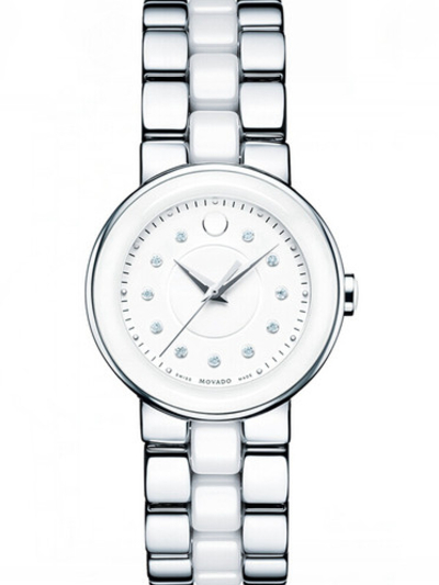 Stainless steel and ceramic case with a stainless steel and ceramic bracelet. Fixed bezel. White dial with silver-toned hands and diamond hour markers. Minute markers around the outer rim. Dial Type: Analog. Quartz movement. Scratch resistant sapphire crystal. Case diameter: 28 mm. Round case shape. Water resistant at 30 meters / 100 feet. Functions: hour, minute, second. Dress watch style. Watch label: Swiss Made. Movado Cerena White Dial Diamond Steel and Ceramic Ladies Watch.