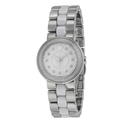Stainless steel case with a stainless steel bracelet with white ceramic center links. Fixed stainless steel bezel set with diamonds. Silver dial with silver-tone hands and diamond hour markers. Minute markers around the outer rim. The Movado dot appears at the 12 o'clock position. Dial Type: Analog. Quartz movement. Scratch resistant sapphire crystal. Pull / push crown. Solid case back. Case diameter: 28 mm. Round case shape. Deployment clasp. Water resistant at 30 meters / 100 feet. Functions: hour, minute, second. Dress watch style. Movado Cerena Silver Dial Stainless Steel White Ceramic Ladies Watch 0606931.