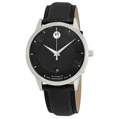 Stainless steel case with a black leather strap. Fixed stainless steel bezel. Black dial with silver-tone dauphine-style hands and index hour markers. Minute markers around the outer rim. The Movado dot at the 12 o'clock position. Dial Type: Analog. Date display at the 6 o'clock position. Automatic movement. Scratch resistant sapphire crystal. Pull / push crown. Transparent case back. Round case shape. Case size: 39.5 mm. Case thickness: 9 mm. Band width: 20 mm. Tang clasp. Water resistant at 30 meters / 100 feet. Functions: date, hour, minute, second. Dress watch style. Watch label: Swiss Made. Movado 1881 Automatic Black Dial Mens Watch 0607019.