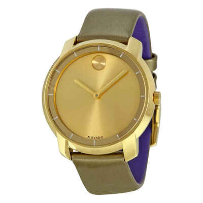 Gold ion-plated stainless steel case with a green leather strap. Fixed gold ion-plated bezel showing hour markings. Yellow gold sunray dial with gold-tone hands. The Movado dot appears at the 12 o'clock position. Dial Type: Analog. Quartz movement. Scratch resistant K1 crystal. Pull / push crown. Solid case back. Case diameter: 36 mm. Case thickness: 7 mm. Round case shape. Band width: 13 mm. Tang clasp. Water resistant at 30 meters / 100 feet. Functions: hour, minute. Casual watch style. Movado Bold Yellow Gold Sunray Dial Green Leather Laides Quartz Watch 3600312.