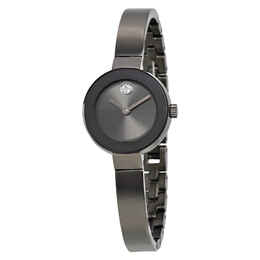 Gunmetal stainless steel case with a gunmetal-plated stainless steel bangle bracelet. Fixed black ion-plated bezel. Gunmetal dial with gunmetal hands. A crystal-set Movado dot appears at the 12 o'clock position. Dial Type: Analog. Quartz movement. Scratch resistant k1 mineral crystal. Pull / push crown. Solid case back. Case diameter: 25 mm. Case thickness: 8 mm. Round case shape. Band width: 15 mm. Band length: 6 inches. Jewelry clasp. Water resistant at 30 meters / 100 feet. Functions: hour, minute. Casual watch style. Movado Bold Crystal Marker Gunmetal-plated Bangle Ladies Watch 3600324.