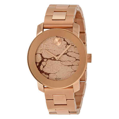 Rose gold ion-plated stainless steel case and bracelet. Fixed rose gold ion-plated bezel. Rose golden glitter dial with rose gold-tone hands. No markers. The Movado dot appears at the 12 o'clock position. Dial Type: Analog. Quartz movement. Scratch resistant K1 crystal crystal. Pull / push crown. Solid case back. Case diameter: 36 mm. Round case shape. Band width: 18 mm. Deployment clasp with push button release. Water resistant at 30 meters / 100 feet. Functions: hour, minute. Dress watch style. Movado Bold Rose Gold Glitter Dial Rose Gold Ion-plated Ladies Watch 3600347.