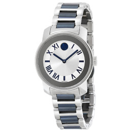 Stainless steel case with a stainless steel with blue ion-plated center links bracelet. Fixed stainless steel bezel. Silver dial with blue hands and Roman numeral hour markers. The Movado dot appears at the 12 o'clock position. Dial Type: Analog. Quartz movement. Scratch resistant K1 mineral crystal. Pull / push crown. Solid case back. Case diameter: 32 mm. Case thickness: 9 mm. Round case shape. Deployment clasp. Water resistant at 30 meters / 100 feet. Functions: hour, minute. Dress watch style. Movado Bold Silver Dial Two-tone Ladies Watch 3600354.