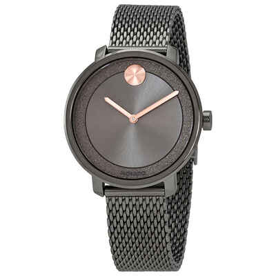 Grey ion-plated stainless steel case with a grey ion-plated stainless steel mesh bracelet. Fixed grey ion-plated bezel. Grey dial with rose gold-tone hands. No markers. The Movado dot appears at the 12 o'clock position. Dial Type: Analog. Quartz movement. Scratch resistant K1 mineral crystal. Pull / push crown. Solid case back. Round case shape. Case size: 34 mm. Case thickness: 7.7 mm. Band width: 15 mm. Fold over slide through clasp. Water resistant at 30 meters / 100 feet. Functions: hour, minute. Dress watch style. Watch label: Swiss Made. Movado Bold Quartz Grey Dial Grey Ion-plated Mesh Ladies Watch 3600581.