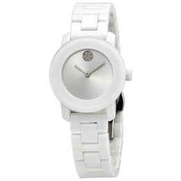 White ceramic case with a white ceramic bracelet. Fixed white ceramic bezel. White crystal dial with silver-tone hands and the signature Movado dot appears at the 12 o'clock position. Dial Type: Analog. Quartz movement. Scratch resistant k1 crystal. Pull / push crown. Solid case back. Round case shape. Case size: 30.8 mm. Butterfly clasp. Water resistant at 30 meters / 100 feet. Functions: hour, minute. Casual watch style. Watch label: Swiss Movt. Movado Bold Quartz White Crystal Dial Ladies Watch 3600616.