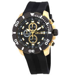 Yellow gold-tone stainless steel case with a black silicone and polyurethane strap. Uni-directional rotating black ion-plated bezel. Black dial with luminous yellow gold-tone hands and index hour markers. Minute markers. Tachymeter markings around the outer rim. Dial Type: Analog. Luminescent hands and markers. Date display at the 3 o'clock position. Chronograph - three sub-dials displaying: 60 second, 60 minute and 1/10th of a second. Hattori caliber VD57 quartz movement. Scratch resistant flame fusion crystal. Pull / push crown. Solid case back. Round case shape. Case size: 52 mm. Case thickness: 14.5 mm. Band width: 26 mm. Band length: 8.25 inches. Tang clasp. Water resistant at 100 meters / 330 feet. Functions: chronograph, tachymeter, date, hour, minute, second. Sport watch style. Watch label: Japan Movt. Invicta Pro Diver Chronograph Quartz Black Dial Mens Watch 27733.