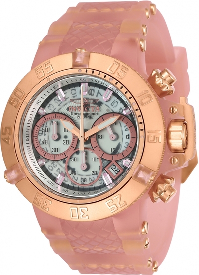Stainless steel case with a pink silicone and plastic strap. Stainless steel rose gold-tone bezel. White dial with gold-tone hands and index hour markers. Minute markers around the outer rim. Dial Type: Analog. Luminescent hands and markers. Date display between 4 and 5 o'clock position. Chronograph - three sub-dials displaying: 60 second, 60 minute and 24 hour. Hattori Caliber VD53 quartz movement. Scratch resistant mineral crystal. Screw down crown. Case size: 42 mm. Round case shape. Band width: 24.5 mm. Water resistant at 200 meters / 660 feet. Functions: chronograph, date, GMT, second time zone, hour, minute, second. Sport watch style. Invicta Subaqua Chronograph Ladies Watch 24383.