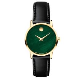 Yellow gold PVD stainless steel case with a black calfskin band. Fixed yellow gold PVD stainless steel bezel. Green mother of pearl dial with gold-tone hands. Concave dot at the 12 o'clock position. Dial Type: Analog. Quartz movement. Scratch resistant sapphire crystal. Pull / push crown. Solid case back. Round case shape, case size: 28 mm. Buckle clasp. Water resistant at 30 meters / 100 feet. Functions: hour, minute. Museum Classic Series. Casual watch style. Watch label: Swiss Made. Movado Museum Classic Quartz Green Mother of Pearl Dial Ladies Watch 0607633.