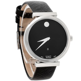 Silver-tone stainless steel case with a black leather strap. Fixed silver-tone stainless steel bezel. Black dial with silver-tone hands. Movado dot appears at the 12 o'clock position. Dial Type: Analog. Date display at the 6 o'clock position. Automatic movement. Scratch resistant sapphire crystal. Pull / push crown. Transparent case back. Round case shape, case size: 32 mm. Buckle clasp. Water resistant at 30 meters / 100 feet. Functions: date, hour, minute. Museum Classic Series. Casual watch style. Watch label: Swiss Made. Movado Museum Classic Automatic Black Dial Ladies Watch 0607675.