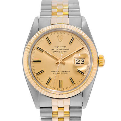 Silver-tone stainless steel case with a two-tone (silver-tone and yellow gold-tone) stainless steel and 18kt yellow gold jubilee bracelet. Fixed yellow gold-tone 18kt yellow gold bezel. Champagne dial with yellow gold-tone hands and index hour markers. Minute markers around the outer rim. Dial Type: Analog. Date display at the 3 o'clock position. Rolex Calibre 3035 Automatic movement, containing 27 Jewels, bitting at 28800 vph, and has a power reserve of approximately 50 hours. Screw down crown. Solid case back. Round case shape, case size: 36 mm. Fold over clasp with a safety release. Functions: date, hour, minute, second, chronometer. Datejust 36 Series. Luxury watch style. Watch label: Swiss Made. Pre-owned Rolex Datejust 36 Automatic Chronometer Champagne Dial Mens Watch 16013 CSJ.