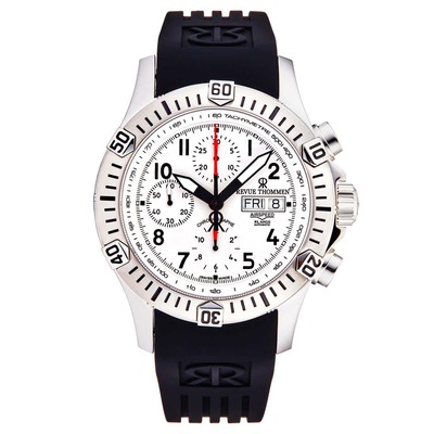 Stainless steel case with a black leather strap. Uni-directional rotating stainless steel bezel. Silver dial with black luminescent, red chronograph hands hands and Arabic numeral hour markers. Minute markers. Tachymeter markers around the outer rim. Dial Type: Analog. Luminescent hands and markers. Day of the week and date display at the 3 o'clock position. Chronograph - three sub-dials displaying: 60 second, 30 minute and 12 hour. ETA-Valjoux caliber 7750 automatic movement, containing 25 Jewels, bitting at 28800 vph, and has a power reserve of approximately 44 hours. Scratch resistant sapphire crystal. Screw down crown. Transparent see through case back. Round case shape. Case size: 45 mm. Case thickness: 15.6 mm. Band width: 22 mm. Fold over clasp with a safety release. Water resistant at 100 meters / 330 feet. Functions: chronograph, tachymeter, date, day of the week, hour, minute, second. Air Speed Xl Series. Sport watch style. Watch label: Swiss Made. Revue Thommen Air Speed XL Chronograph Automatic Silver Dial Mens Watch 16071.6822.