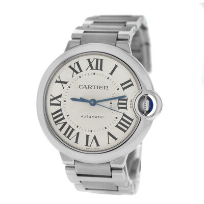 Silver-tone stainless steel case and bracelet. Fixed silver-tone stainless steel bezel. Silver-tone dial with blued-steel sword-shaped hands and Roman numeral hour markers. Minute markers around the outer rim. Dial Type: Analog. Cartier Calibre 076 Automatic movement, based upon ETA 2670, containing 25 Jewels, bitting at 28800 vph, and has a power reserve of approximately 38 hours. Scratch resistant sapphire crystal. Cabochon crown. Solid case back. Round case shape, case size: 36 mm. Fold over clasp with a safety release. Water resistant at 30 meters / 100 feet. Functions: hour, minute, second. Ballon Bleu De Cartier Series. Casual watch style. Watch label: Swiss Made. Item Variations: 3284. Pre-owned Cartier Ballon Bleu de Cartier Automatic Silver Dial Unisex Watch W6920046.