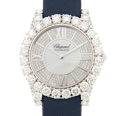 Automatic movement ladies watch from Chopard. Swiss Made with an elegant silver-tone dial featuring Roman numeral hour markers and a diamond set bezel. Includes sapphire crystal for scratch resistance, round case shape measuring 36 mm, screw down crown, transparent case back, fixed blue satin strap, and displays hours and minutes.