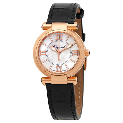 Analog quartz watch with mother of pearl dial, rose gold case, black alligator leather strap. Features luminous hands and index hour markers including Roman numerals at the 3,6,9,12 o'clock positions, minute markers on an inner ring. Includes date display at the 3 o'clock position. Equipped with a scratch-resistant sapphire crystal glass, pull/push crown, amethyst cabochon detail on crown and lugs, solid case back. Round case shape measuring 28 mm diameter and 9 mm thickness; band length is approximately 6 inches fitted with a tang clasp. Water resistant up to 50 meters / 165 feet (functions: hour, minute, second). Model number 384238-5001bk.