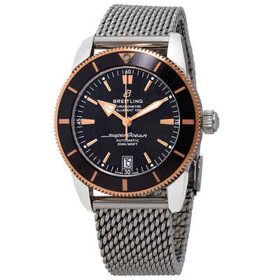 A Breitling Automatic Chronometer watch for men featuring a black dial measuring 42 mm. It boasts an analog display with luminous rose gold hands and index hour markers, minute markers on the outer rim, date at 6 o'clock position, and comes equipped with the Swiss Breitling Calibre 20 automatic movement having a 70-hour power reserve. The case is crafted from stainless steel mesh bracelet, set with an unidirectional rotating bezel made of black ceramic ring and features an 18kt rose gold insert. It includes scratch-resistant sapphire crystal glass, screw-down crown mechanism, solid case back, date function, and is water resistant up to 200 meters (660 feet). The luxury timepiece has analog dial type.