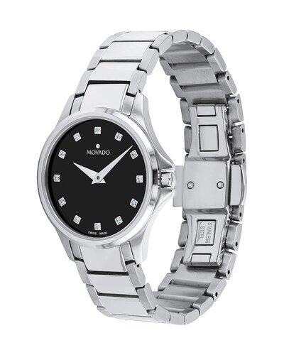 Silver-tone stainless steel case and bracelet. Fixed bezel. Black dial with silver-tone hands and diamonds hour markers. Dial Type: Analog. Quartz movement. Scratch resistant sapphire crystal. Pull / push crown. Solid case back. Round case shape, case size: 28 mm. Deployment clasp. Water resistant at 30 meters / 100 feet. Functions: hour, minute. Dress watch style. Watch label: Swiss Made. Movado Quartz Diamond Black Dial Ladies Watch 0607452.