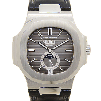 Silver-tone stainless steel case with black crocodile leather strap. Fixed silver-tone bezel. Black dial featuring luminous stick hour markers and minute indices, along with a date display at the 6 o'clock position. Sub-dials include annual calendar (day/month/year), day of week, month indicator, 24-hour GMT hand, moon phase display, and seconds function. Patek Caliber 324 S QA LU 24H/303 automatic mechanical movement with 34 jewels, composed of 347 parts beating at 28800 vph (5Hz). Approximate power reserve: 45 hours. Scratch-resistant sapphire crystal. Screw-down crown equipped for water resistance up to 120 meters / 400 feet. Cushion case shape measuring 40.5 mm in diameter with a skeleton case back and fold-over clasp with safety release.