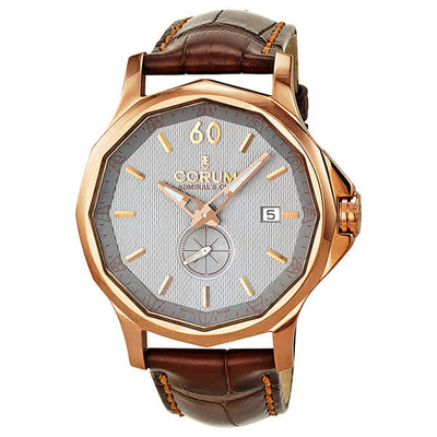 Automatic movement with 42 hour power reserve. 18 kt rose gold case, light grey dial featuring luminescent hands and stick hour markers including minute markers around the outer rim. Fixed 18kt rose gold bezel on a brown crocodile leather strap equipped with a tang clasp. Includes small seconds sub-dial located above the 6 o'clock position, date display at the 3 o'clock position. Scratch resistant sapphire crystal glass. Skeleton case back design. Water resistant to 50 meters / 165 feet depth. Luxury watch style from Swiss Made manufacturer Corum.