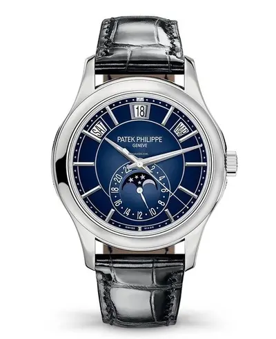 Authentic Patek Philippe watch model 5205G-013. This is a brand new annual calendar automatic men's luxury timepiece featuring a stunning blue sunburst dial. The case is crafted from 18k white gold and equipped with a shiny black alligator leather strap secured by a tang clasp, along with fixed bezel. It displays hour markers and hands in white gold, includes date at the 12 o'clock position, and features a moonphase sub-dial located at the six o'clock mark. Powered by Patek Philippe Calibre 324 S QA LU 24H/206 movement with an automatic winding mechanism and providing a power reserve of up to 45 hours. The watch boasts complications including calendar functionality, hour minute second display, moonphase indication, water resistance rated at 30 meters (100 feet), scratch-resistant sapphire crystal glass, round case shape measuring 40mm in diameter and 11.36mm thick, a transparent case back, and comes with a standard WatchMaxx warranty period of two years.