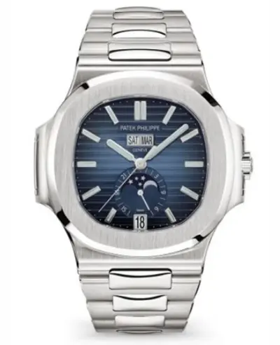 Brand new authentic Patek Philippe Nautilus, model designated as 5726/1A-014 or 57261A014. Features a stainless steel case and matching bracelet. Equipped with a stainless steel bezel. The dial is blue-black gradated with luminous index hour markers displaying the day below the 12 o'clock position, the month beneath that display, and the date at the 6 o'clock position. Powered by an automatic self-winding movement. Includes calendar functions for displaying the day of the week and month below twelve o'clock. Sub-dials feature a moonphase indication. Crown is screwed down. Secured with a scratch-resistant sapphire crystal. The case has a cushion shape measuring 40.5mm in diameter. Case back is transparent. Comes with a two-year WatchMaxx warranty.