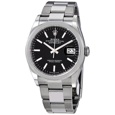 Silver-tone stainless steel case with a silver-tone stainless steel rolex oyster bracelet. Fixed- domed bezel. Black dial with silver-tone hands and index hour markers. Dial Type: Analog. Luminescent hands and markers. Date display at the 3 o'clock position. Rolex Calibre 3235 Automatic movement, based upon Rolex 3035, containing 31 Jewels, bitting at 28800 vph, and has a power reserve of approximately 70 hours. Scratch resistant sapphire crystal. Screw down crown. Solid case back. Round case shape. Case size: 36 mm. Folding oyster clasp. Water resistant at 100 meters / 330 feet. Functions: date, hour, minute, second. Luxury watch style. Watch label: Swiss Made. Pre-owned Rolex Datejust 36 Automatic Black Dial Mens Oyster Watch 126200BKSO.