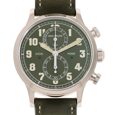 Analog watch with white gold case, green calfskin strap. Features a fixed bezel and khaki green lacquered dial marked with Arabic numerals. Includes sub-dials for the second hand travel time zone (60 seconds) and date functions. Powered by Patek Philippe Calibre CH 28-520 C FUS automatic movement, showcasing complications such as column wheel construction and a day/night indicator. Movement has 34 jewels, operates at 28800 vph with approximately 55 hours power reserve from the 370-part mechanism.
