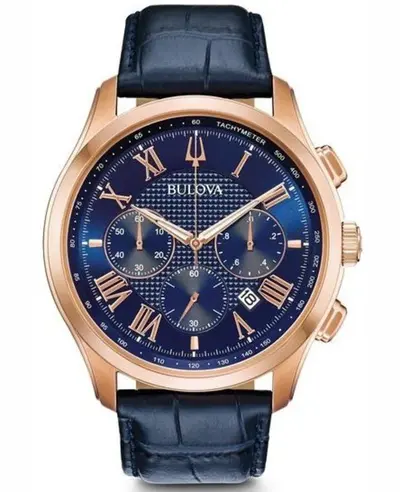 Brand New Authentic Bulova Classic Blue Chronograph Dial Blue Leather Strap Men's Watch Model 97B170. Stainless Steel case with Blue Leather Crocodile strap. Deployment clasp. Fixed bezel. Dial description: Rose Gold tone hands and Roman Numeral/Index hour markers with minute markers around the outer rim and 3 sub-dials on a Blue dial. Battery Operated Quartz movement. Calendar: Date between 4 and 5 o'clock position. Chronograph sub-dials display: 1/10th of a Second, 60 Second, 60 Minute. Watch functions: Date, Hour, Minute, Second, Chronograph. Pull/Push crown. Mineral crystal. Round case shape. Case size: 45.5mm. Case thickness: 12.3mm. Solid case back. 30 Meters - 100 Feet water resistant. 2 year WatchMaxx warranty.