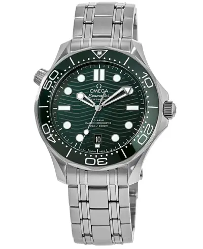A brand new authentic Omega Seamaster Diver 300M watch, model number 210.30.42.20.10.001. Features a stainless steel case paired with a silver stainless steel bracelet. Includes a unidirectional rotating bezel. The dial is green featuring silver tone hands and index/dot hour markers along with minute markers on the outer rim. Powered by an automatic chronometer movement, specifically Omega Calibre 8800. Displays date, hours, minutes, seconds and power reserve information. Equipped with a screw-in crown for easy winding or setting. The sapphire crystal display is scratch resistant. Case shape is round measuring 42mm in diameter with a transparent case back allowing visibility of the movement. Rated at 30 meters or approximately 100 feet water resistance depth. Comes with a 5-year WatchMaxx warranty.