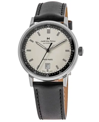 A brand new authentic men's Hamilton American Classic watch, model H38425720. Features a polished stainless steel case and black calf leather strap with tang clasp. The two-tone beige dial includes luminescent white stick hour markers and hands, date function at the 6 o'clock position, automatic self-winding movement (Caliber H-10), screw-down crown, scratch-resistant sapphire crystal, round shape measuring 40mm in diameter and 10.95mm thick, solid case back, and is rated for water resistance up to 50 meters / 165 feet with an included 2-year WatchMaxx warranty.
