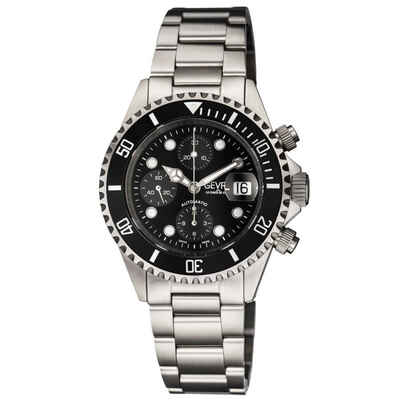 Silver-tone stainless steel case and bracelet. Uni-directional rotating silver-tone stainless steel with an inlaid black ring bezel. Black dial with luminous silver-tone hands and dot hour markers. Minute markers around the outer rim. Dial Type: Analog. Luminescent hands and markers. Date display at the 3 o'clock position. Chronograph - three sub-dials displaying: 60 second, 30 minute and 12 hour. Sellita Caliber SW500 Automatic movement, containing 25 Jewels, bitting at 28800 vph, and has a power reserve of approximately 44 hours. Scratch resistant sapphire crystal. Screw down crown. Solid case back. Round case shape, case size: 43 mm, case thickness: 13 mm. Band width: 22 mm, band length: 9.5 inches. Deployment with push button release clasp. Water resistant at 200 meters / 660 feet. Functions: date, hour, minute, second. Fashion Series. Casual watch style. Watch label: Swiss Made. Gevril Fashion BlackDial Mens Watch 4157A.