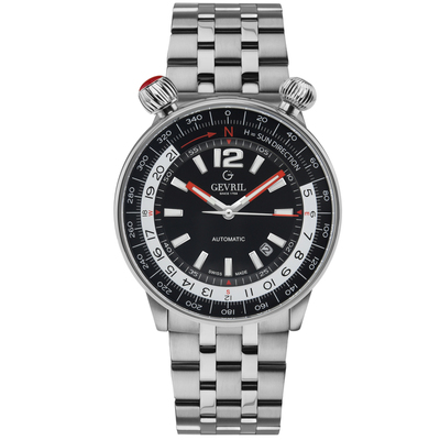 Analog automatic men's watch with black dial. Features stainless steel case and bracelet, fixed bezel, luminous hands/markers, silver-tone/red color for indicators/hands, index hour markers, Arabic numeral at 12 o'clock position, minute markers (at 5-minute intervals), 24-hour markings, compass function including degrees/360 degree markings. Includes date display positioned between the fourth and fifth hour marks. Equipped with a scratch-resistant sapphire crystal lens. Powered by an automatic movement. Comes with a deployment clasp for secure fastening. Water resistant up to 50 meters or 165 feet.