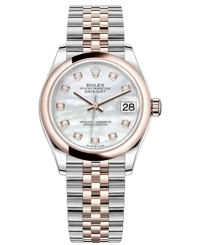 Polished stainless steel and 18kt Everose gold case with fixed domed bezel. Accompanied by an 18kt Everose gold and stainless steel Jubilee bracelet equipped with a crownclasp. Features a mother-of-pearl dial embellished with polished rose gold hour markers (including diamonds) and date function at the 3 o'clock position. Powered by Rolex Calibre 2236 automatic chronometer movement ensuring precision and reliability, offering approximately 55 hours power reserve. Includes screw-in winding crown, scratch-resistant sapphire crystal glass front, round case shape measuring 31mm in diameter with solid case back. Water resistant up to 100 meters / 330 feet depth. Comes complete with a standard 5 year Rolex Watch warranty.