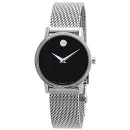 Stainless steel case, stainless steel mesh bracelet, fixed bezel, black dial face with silver-tone hour markers and hands, no diamond markers. Features a distinct dot at the 12 o'clock position for brand identity. Equipped with quartz movement ensuring accuracy, scratch resistant sapphire crystal lens, pull/push crown mechanism, solid case back, round shape, dimensions: 28 mm diameter x 5.8 mm thickness. Band width: 15 mm, equipped with a fold over clasp. Water resistance up to 30 meters (100 feet). Functions include analog hour and minute display only. Style is dress watch suitable for women, Swiss Made.