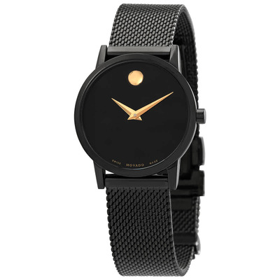 Black PVD stainless steel case; black stainless steel mesh bracelet with 15 mm width; fixed black PVD bezel; black dial featuring yellow gold PVD hands and a 12 o'clock Movado dot indicator; analog dial type; quartz movement mechanism; scratch-resistant sapphire crystal lens; pull/push crown operation; solid case back; round case shape measuring 28 mm in diameter; equipped with deployment clasp closure; water resistant up to 30 meters or 100 feet depth; provides hour and minute functions only; part of the Museum Classic Series; casual watch style design; Swiss Made quality label.