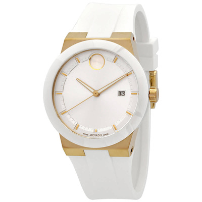 Gold-tone stainless steel case with a white silicone strap. Fixed white stainless steel bezel. White dial with gold-tone hands and index hour markers. Dial Type: Analog. Luminescent hands and markers. Date display at the 3 o'clock position. Quartz movement. Scratch resistant K1 crystal. Pull / push crown. Solid case back. Case size: 421.3 mm, case thickness: 10 mm. Band width: 21 mm. Buckle clasp. Functions: date, hour, minute, second. Bold Series. Watch label: Swiss Made. Movado Bold Quartz White Dial Mens Watch 3600899.