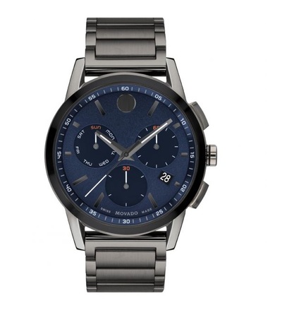 Gunmetal PVD stainless steel case and bracelet. Fixed black stainless steel bezel. Blue dial with gunmetal hands and index hour markers. Arabic numeral minute markers (at 5 minute intervals) around the outer rim. Movado dot appears at the 12 o'clock position. Dial Type: Analog. Date display at the 4 o'clock position. Three sub-dials displaying: 60 second, 30 minute and day. Quartz movement. Scratch resistant sapphire crystal. Pull / push crown. Solid case back. Round case shape, case size: 43 mm. Deployment clasp. Water resistant at 30 meters / 100 feet. Functions: chronograph, date, day, hour, minute, second. Museum Sport Series. Sport watch style. Watch label: Swiss Made. Movado Museum Sport Chronograph Quartz Blue Dial Mens Watch 0607624.