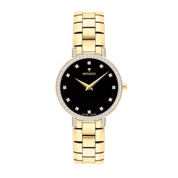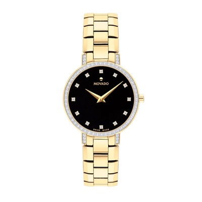 Gold-tone stainless steel case and bracelet. Fixed gold-tone bezel with diamond set. Black dial with gold-tone hands and diamond hour markers. Dial Type: Analog. Quartz movement. Scratch resistant sapphire crystal. Pull / push crown. Solid case back. Round case shape, case size: 28 mm. Deployment clasp. Water resistant at 30 meters / 100 feet. Functions: hour, minute. Additional Info: 76 gemstones 0.296 ct. gemston clarity s1. Faceto Series. Dress watch style. Watch label: Swiss Made. Movado Faceto Quartz Diamond Black Dial Ladies Watch 0607644.