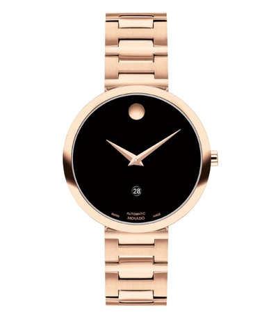 Rose gold-tone stainless steel case and bracelet. Fixed rose gold-tone stainless steel bezel. Black dial with rose gold-tone hands. Movado dot appears at the 12 o'clock position. Dial Type: Analog. Date display at the 6 o'clock position. Automatic movement. Scratch resistant sapphire crystal. Pull / push crown. Transparent case back. Round case shape, case size: 32 mm. Deployment clasp. Water resistant at 30 meters / 100 feet. Functions: date, hour, minute. Museum Classic Series. Casual watch style. Watch label: Swiss Made. Movado Museum Classic Automatic Black Dial Ladies Watch 0607680.